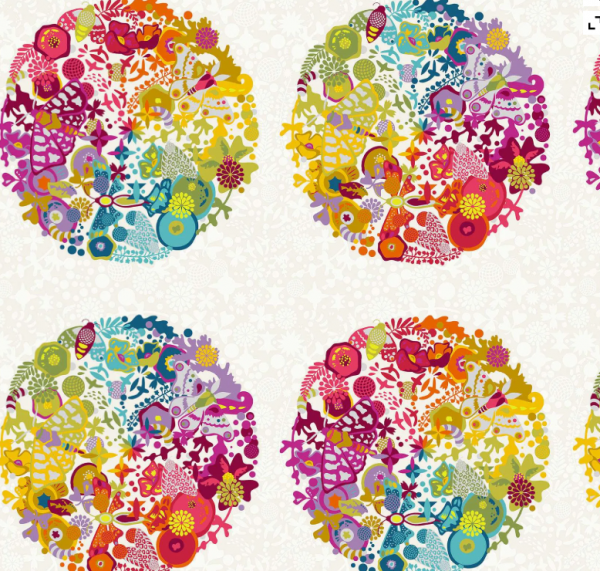 From Makower Color Wheel Collection , a trio of prints in all the colours of the rainbow , also featuring colourful toadstools and butterflies and finished off with colourful orbs with moths and caterpillar’s and flowers.